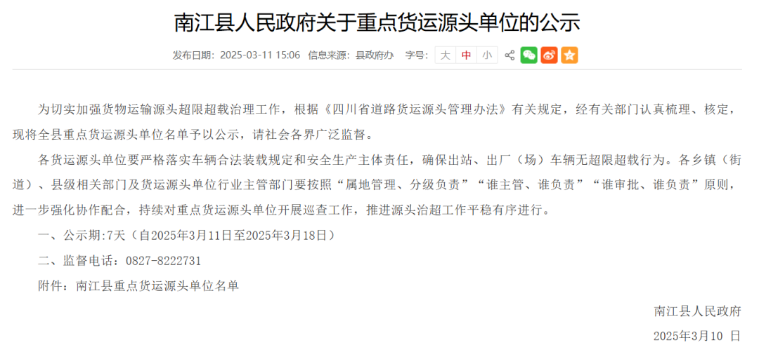 日前,南江縣人民政府發(fā)布關(guān)于重點(diǎn)貨運(yùn)源頭單位的公示稱,為切實(shí)加強(qiáng)貨物運(yùn)輸源頭超限超載治理工作,根據(jù)《四川省道路貨運(yùn)源頭管理辦法》有關(guān)規(guī)定,經(jīng)有關(guān)部門(mén)認(rèn)真梳理、核定,現(xiàn)將全縣重點(diǎn)貨運(yùn)源頭單位名單予以公示,請(qǐng)社會(huì)各界廣泛監(jiān)督。