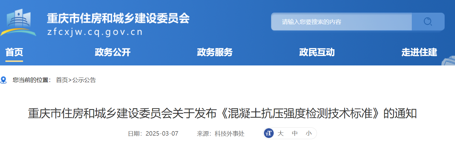 日前,重慶市住房和城鄉(xiāng)建設(shè)委員會(huì)關(guān)于發(fā)布《混凝土抗壓強(qiáng)度檢測(cè)技術(shù)標(biāo)準(zhǔn)》的通知稱,已批準(zhǔn)《混凝土抗壓強(qiáng)度檢測(cè)技術(shù)標(biāo)準(zhǔn)》為重慶市工程建設(shè)地方標(biāo)準(zhǔn),編號(hào)為DBJ50/T-195-2025,自2025年6月1日起施行,原《回彈法檢測(cè)混凝土抗壓強(qiáng)度技術(shù)規(guī)程》DBJ50-057-2006、《高強(qiáng)混凝土抗壓強(qiáng)度檢測(cè)技術(shù)規(guī)程》DBJ50/T-195-2014同時(shí)廢止。標(biāo)準(zhǔn)文本可在標(biāo)準(zhǔn)備案后登錄重慶市住房和城鄉(xiāng)建設(shè)技術(shù)發(fā)展中心官網(wǎng)免費(fèi)下載。本標(biāo)準(zhǔn)由重慶市住房和城鄉(xiāng)建設(shè)委員會(huì)負(fù)責(zé)管理,重慶市建筑科學(xué)研究院有限公司負(fù)責(zé)具體技術(shù)內(nèi)容解釋。