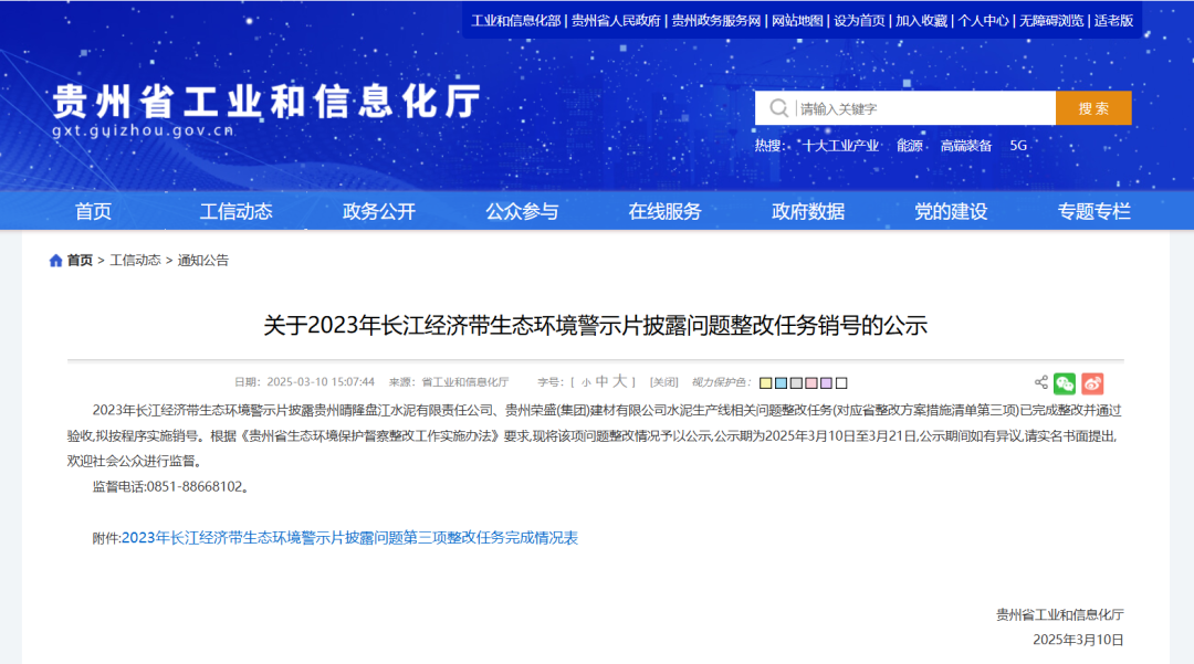 3月10日,貴州省工業(yè)和信息化廳發(fā)布關(guān)于2023年長(zhǎng)江經(jīng)濟(jì)帶生態(tài)環(huán)境警示片披露問題整改任務(wù)銷號(hào)的公示稱,《貴州省2023年長(zhǎng)江經(jīng)濟(jì)帶生態(tài)環(huán)境警示片披露問題整改措施清單》第三項(xiàng)整改任務(wù):黔西南州貴州晴隆盤江水泥有限責(zé)任公司一條窯徑4米、產(chǎn)能為2500噸/天熟料生產(chǎn)線和黔西南州貴州榮盛(集團(tuán))建材有限公司一條窯徑4.8米、產(chǎn)能為4500噸/天的熟料生產(chǎn)線存在批小建大問題。