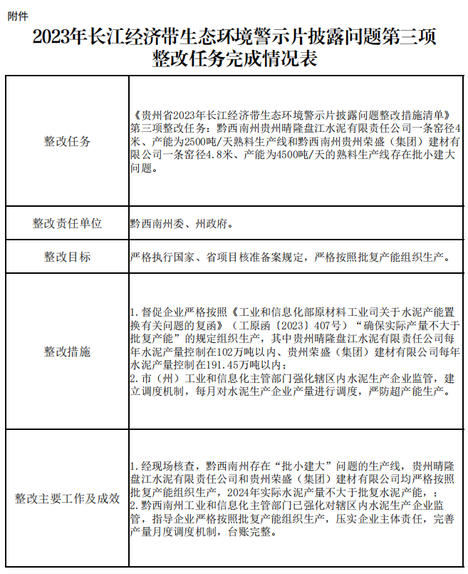 經(jīng)現(xiàn)場(chǎng)核查,黔西南州存在“批小建大”問題的生產(chǎn)線,貴州晴隆盤江水泥有限責(zé)任公司和貴州榮盛(集團(tuán))建材有限公司均嚴(yán)格按照批復(fù)產(chǎn)能組織生產(chǎn),2024年實(shí)際水泥產(chǎn)量不大于批復(fù)水泥產(chǎn)能。