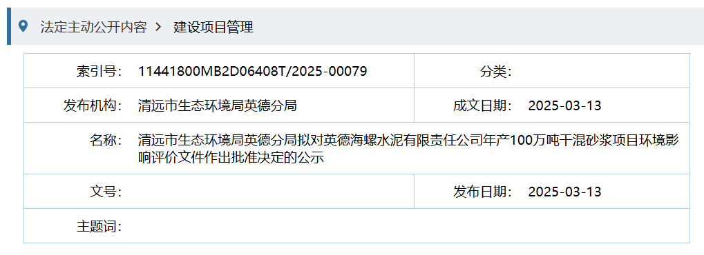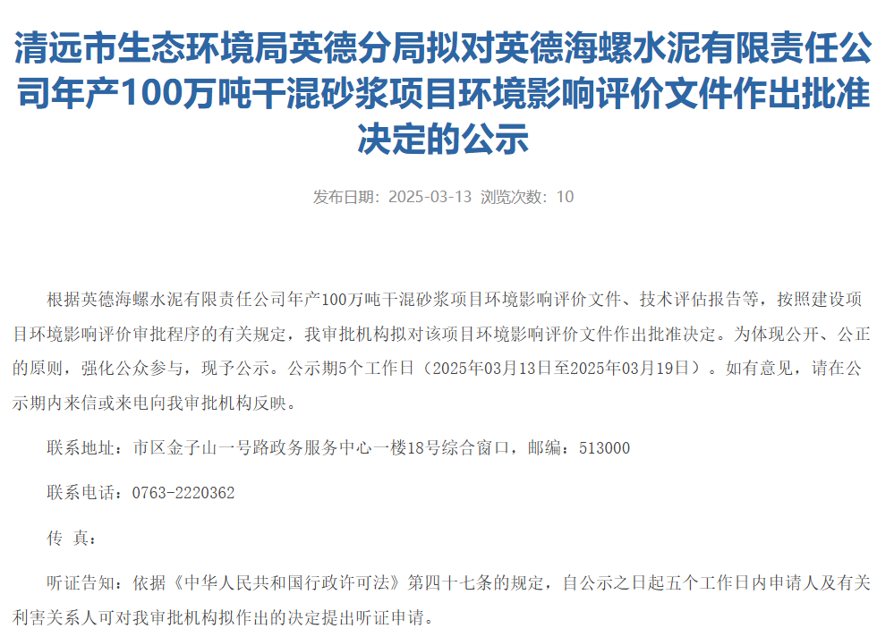 3月13日,清遠市生態(tài)環(huán)境局英德分局?jǐn)M對英德海螺水泥有限責(zé)任公司年產(chǎn)100萬噸干混砂漿項目環(huán)境影響評價文件作出批準(zhǔn)決定的公示。