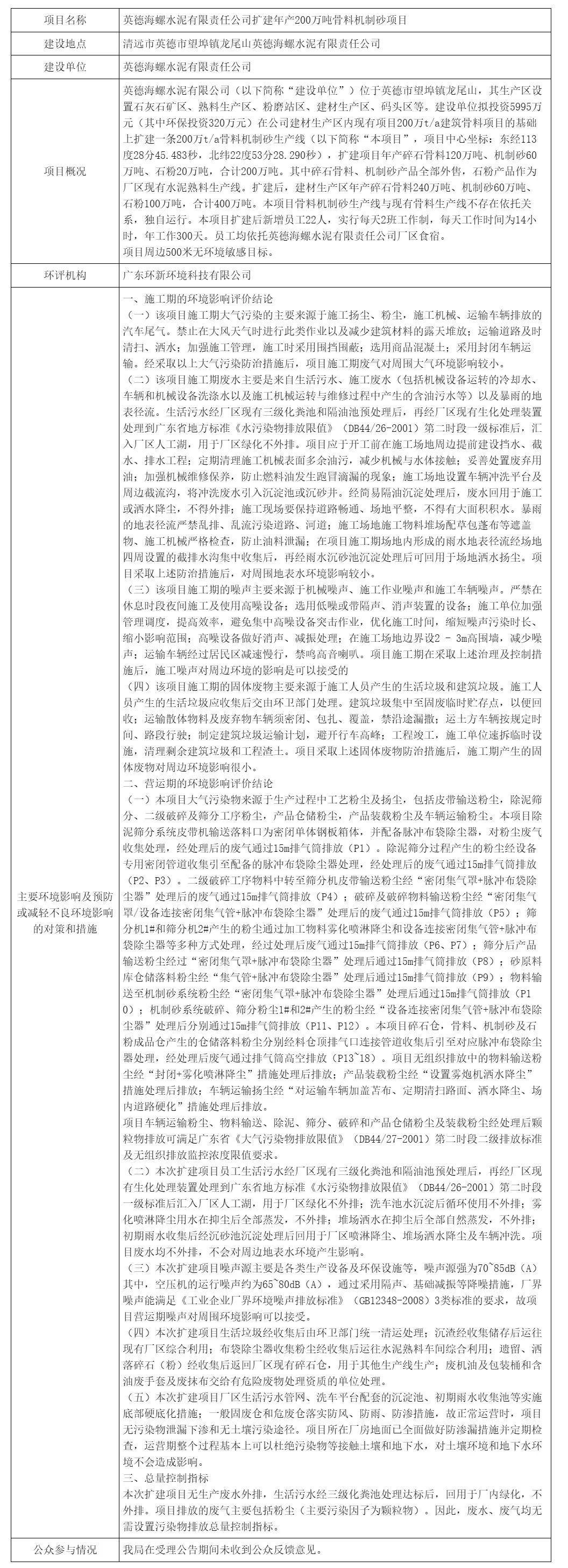 同日發(fā)布擬對英德海螺水泥有限責(zé)任公司擴建年產(chǎn)200萬噸骨料機制砂項目環(huán)境影響評價文件作出批準(zhǔn)決定的公示稱,根據(jù)英德海螺水泥有限責(zé)任公司擴建年產(chǎn)200萬噸骨料機制砂項目環(huán)境影響評價文件、技術(shù)評估報告等,按照建設(shè)項目環(huán)境影響評價審批程序的有關(guān)規(guī)定,審批機構(gòu)擬對該項目環(huán)境影響評價文件作出批準(zhǔn)決定。為體現(xiàn)公開、公正的原則,強化公眾參與,現(xiàn)予公示。