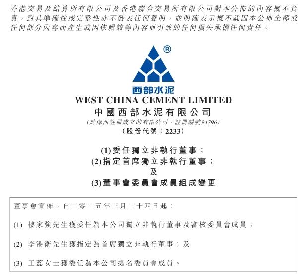 3月24日,西部水泥發(fā)布公告。樓家強獲委任為公司獨立非執(zhí)行董事及審核委員會成員,李港衛(wèi)獲指定為首席獨立非執(zhí)行董事,王蕊獲委任為公司提名委員會成員。