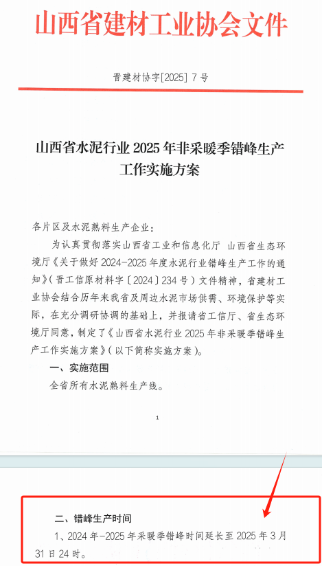 根據(jù)山西省建材工業(yè)協(xié)會《山西省水泥行業(yè)2025非采暖季錯峰生產(chǎn)工作實施方案》(晉建材字〔2025〕3號),全省水泥熟料企業(yè)2024年~2025年采暖季錯峰時間延長至2025年3月31日24時。
