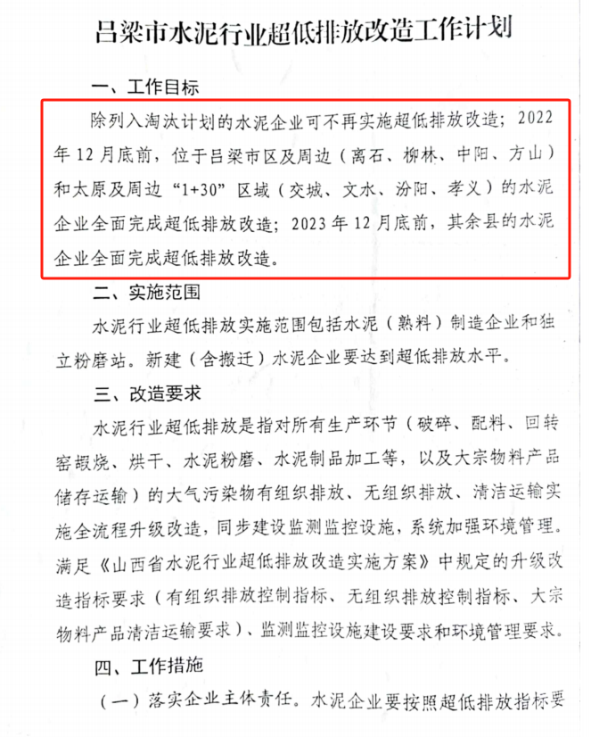 呂梁市生態(tài)環(huán)境局與工信局更早前聯(lián)合印發(fā)的《呂梁市水泥行業(yè)超低排放改造工作計劃》(呂環(huán)發(fā)〔2021〕121號)明確要求,全市水泥企業(yè)需在2022年12月底前完成超低排放改造并通過驗收。2023年山西省政府辦公廳發(fā)布的《加強(qiáng)汾河谷地污染治理若干措施》(晉政辦發(fā)〔2023〕67號)進(jìn)一步將改造時限放寬至2024年10月。
