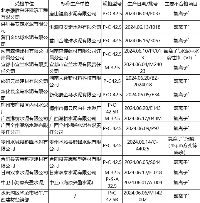 日前,國(guó)家市場(chǎng)監(jiān)管總局發(fā)布《2024年電子產(chǎn)品用鋰離子電池和電池組等27種產(chǎn)品質(zhì)量國(guó)家監(jiān)督抽查情況通報(bào)》稱,共抽查檢驗(yàn)7841家生產(chǎn)單位、2937家銷售單位的8218批次產(chǎn)品,發(fā)現(xiàn)不合格產(chǎn)品740批次。其中,水泥產(chǎn)品共抽查880批次,在四川、山東、遼寧、黑龍江、河北、湖南等23個(gè)省份106家銷售單位抽查115批次產(chǎn)品,在山東、河北、四川、遼寧、山西、廣東等30個(gè)省份765家生產(chǎn)單位抽查765批次產(chǎn)品,抽查共發(fā)現(xiàn)29批次產(chǎn)品不合格。其中包含16批次產(chǎn)品氯離子不合格、4批次產(chǎn)品水泥中水溶性鉻(Ⅵ)不合格、2批次產(chǎn)品強(qiáng)度不合格,均為安全項(xiàng)目;5批次產(chǎn)品細(xì)度不合格、3批次產(chǎn)品燒失量不合格、1批次產(chǎn)品三氧化硫不合格。