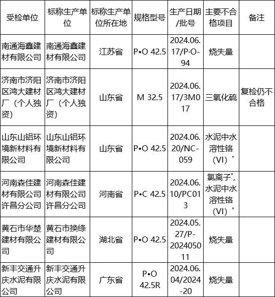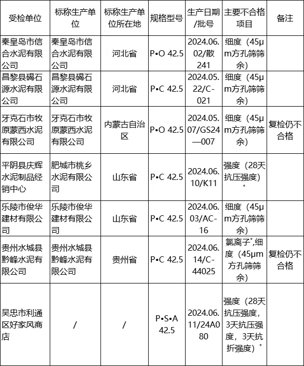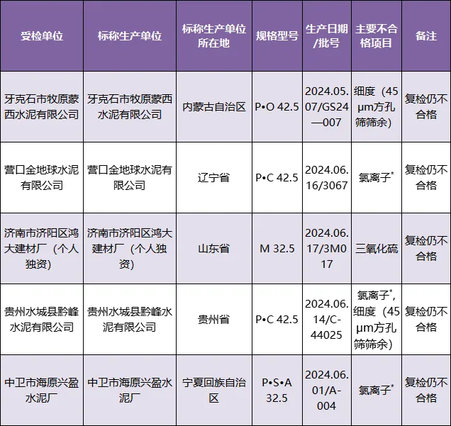 牙克石市牧原蒙西水泥有限公司、營(yíng)口金地球水泥有限公司、貴州水城縣黔峰水泥有限公司、中衛(wèi)市海原興盈水泥廠、濟(jì)南市濟(jì)陽(yáng)區(qū)鴻大建材廠等7個(gè)批次復(fù)檢仍不合格。