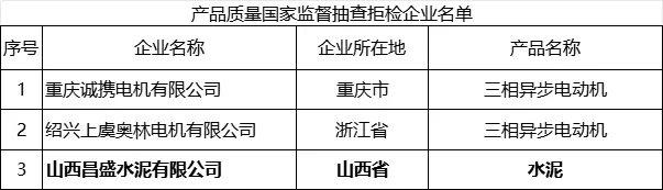 (三)拒檢情況。本次抽查中,重慶誠(chéng)攜電機(jī)有限公司、紹興上虞奧林電機(jī)有限公司、山西昌盛水泥有限公司違反《產(chǎn)品質(zhì)量法》規(guī)定,無正當(dāng)理由拒絕接受監(jiān)督抽查。