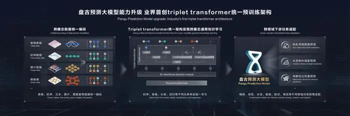 本次盤古預(yù)測(cè)大模型的關(guān)鍵升級(jí)點(diǎn)是,采用業(yè)界首創(chuàng)的triplet transformer統(tǒng)一預(yù)訓(xùn)練架構(gòu),將不同行業(yè)的數(shù)據(jù),包括工藝參數(shù)的表格數(shù)據(jù),設(shè)備運(yùn)行日志的時(shí)間序列數(shù)據(jù),產(chǎn)品檢測(cè)的圖片數(shù)據(jù)進(jìn)行統(tǒng)一的三元組編碼,并在同一框架內(nèi)高效處理和預(yù)訓(xùn)練,極大地提升預(yù)測(cè)大模型的精度,并大幅提升跨行業(yè)、跨場(chǎng)景的泛化性。