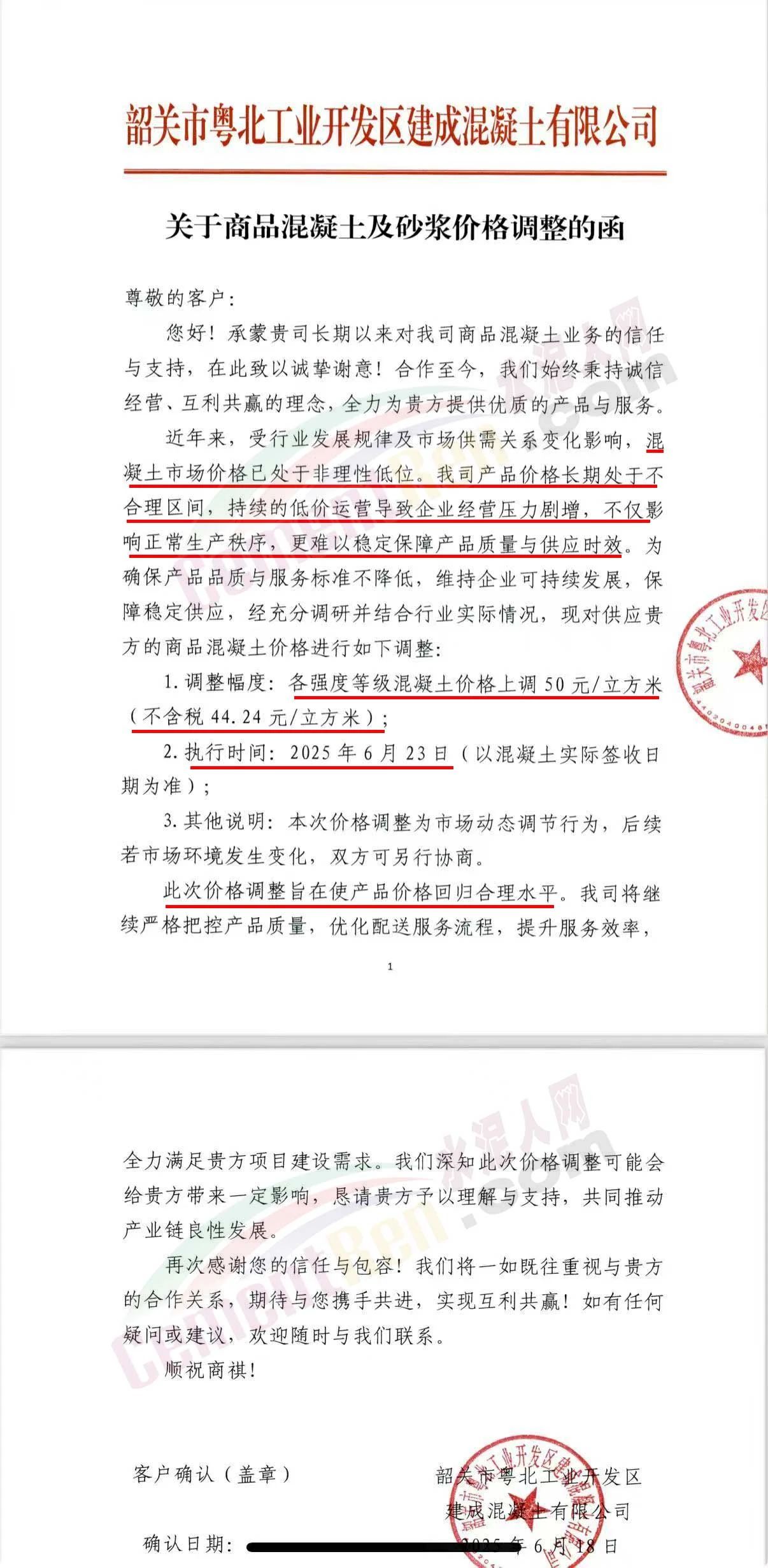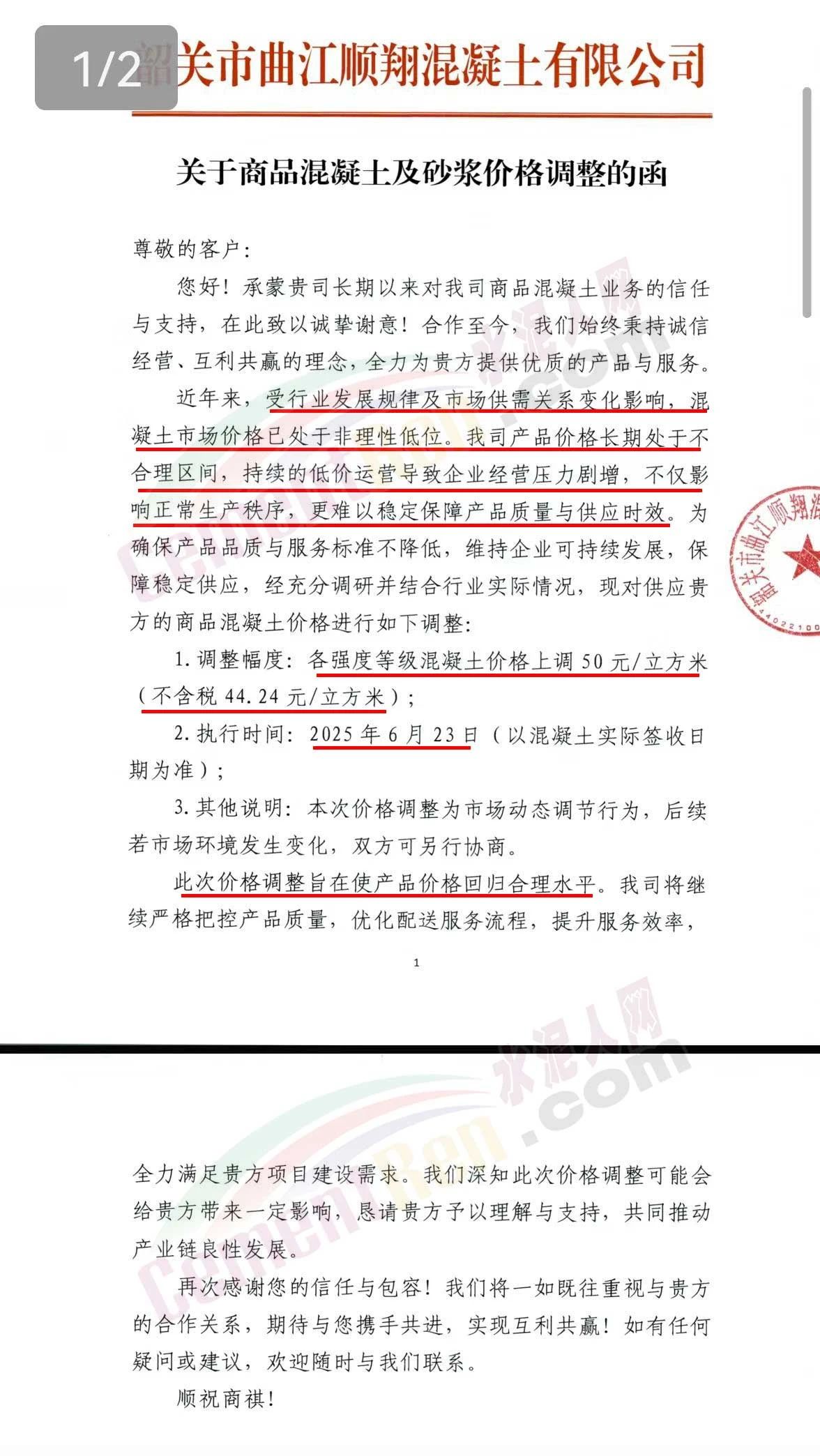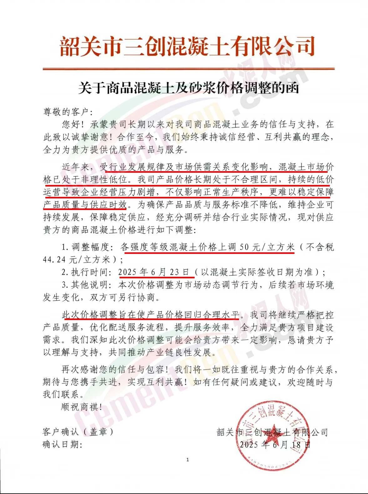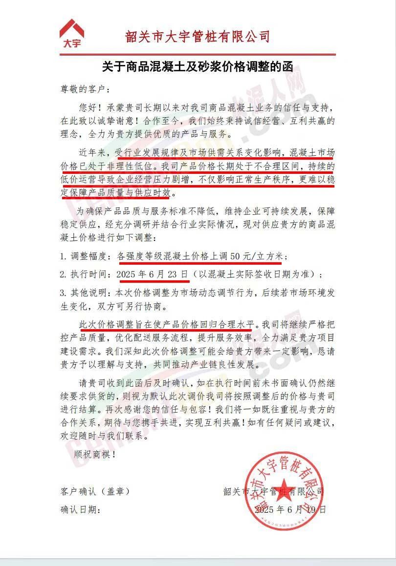 近日,乳源瑤族自治縣宏建商品混凝土有限公司、韶關(guān)市城興住宅工業(yè)有限公司、韶關(guān)市三創(chuàng)混凝土有限公司等近10家商品混凝土企業(yè)聯(lián)合發(fā)布調(diào)價(jià)函,宣布自2025年6月23日起,各強(qiáng)度等級(jí)混凝土價(jià)格統(tǒng)一上調(diào)50元/立方米。這一舉措不僅引發(fā)了行業(yè)震動(dòng),更被視為混凝土企業(yè)在長(zhǎng)期低價(jià)競(jìng)爭(zhēng)后的一次“絕地反擊”。