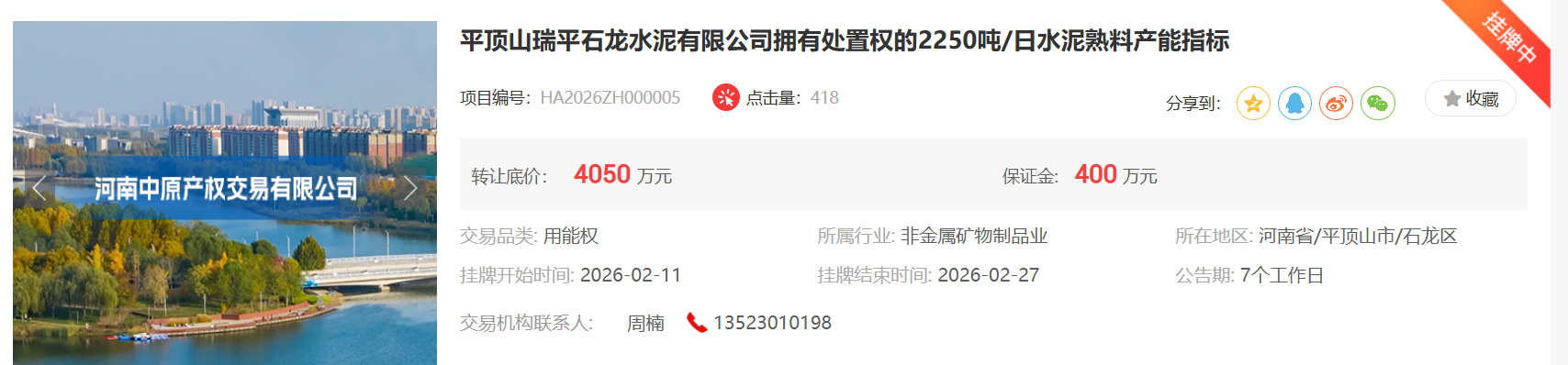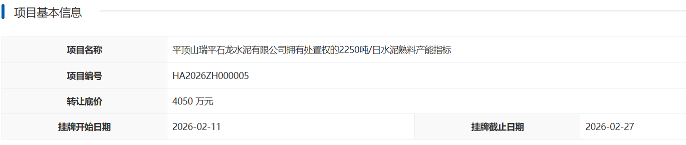 近日,河南中原產(chǎn)權(quán)交易有限公司發(fā)布公告,平頂山瑞平石龍水泥有限公司2250 噸 / 日水泥熟料產(chǎn)能指標(biāo)正式掛牌出讓,項目編號HA2026ZH000005,轉(zhuǎn)讓底價4050 萬元,保證金400 萬元,掛牌時間為 2026 年 2 月 11 日至 2 月 27 日。